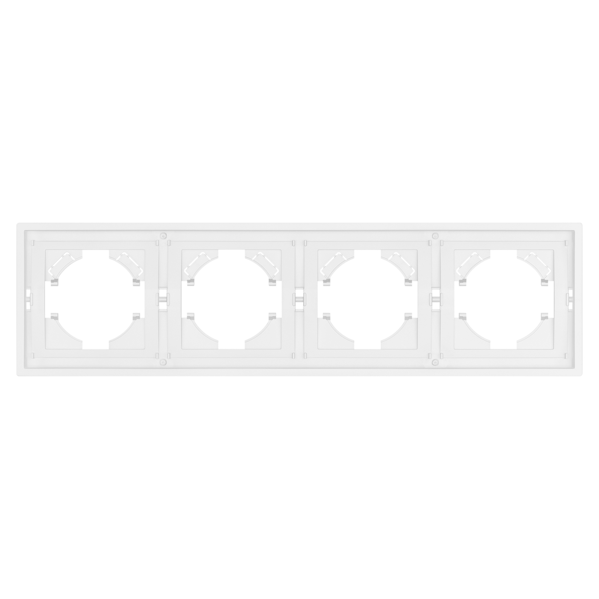 Рамка пластиковая на 4 поста, под встраиваемый механизм. Цвет - белый. Среднего уровня герметичности IP20. Ориентация монтажа горизонтальная.